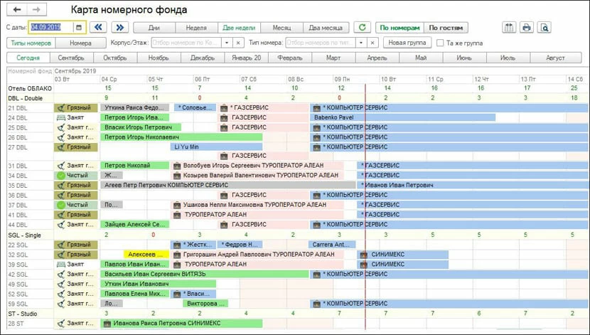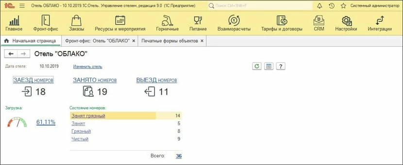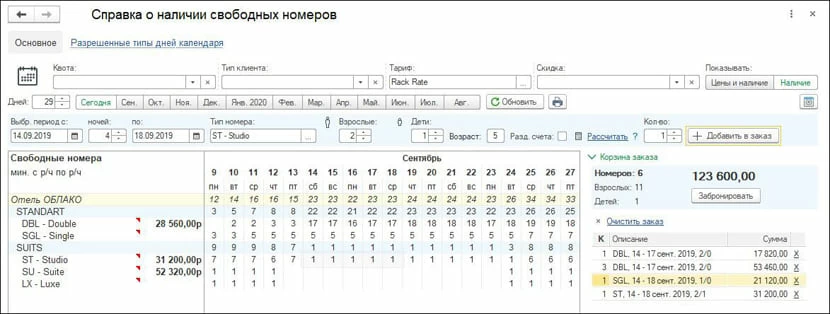 Форма наличия номеров позволяет быстро оценить загруженность, проверить цены на номера и забронировать в 2 клика как один номер, так и целую группу номеров. В результате ускоряется обслуживание и клиент может получить счет с подписью и печатью за несколько минут.