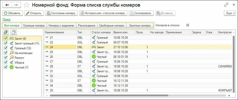 Для отслеживания занятости номеров и состояния уборки каждому присваивается статус. Изначально все номера отеля “свободные и чистые”. Когда в него въезжает гость, номеру присваивается статус “занят, чистый”. На следующий день номер нуждается в уборке, поэтому его статус меняется на “занят, грязный”. После того, как его убрала горничная, статус снова меняется на “занят, чистый”. Когда гость выезжает, номеру присваивается статус “свободный, грязный”. После уборки горничная меняет статус на “свободный, чистый”, а в номер можно заселить новых гостей.