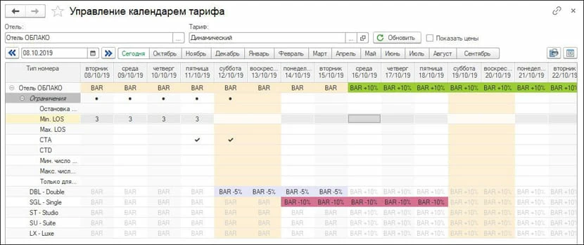 Система управления тарифами позволит установить гибкие тарифы. А с помощью календаря управления ценой и ограничениям по тарифу можно настроить уровень цен в зависимости от сезона. При высокой загрузке отеля система автоматически поднимет уровень цены.