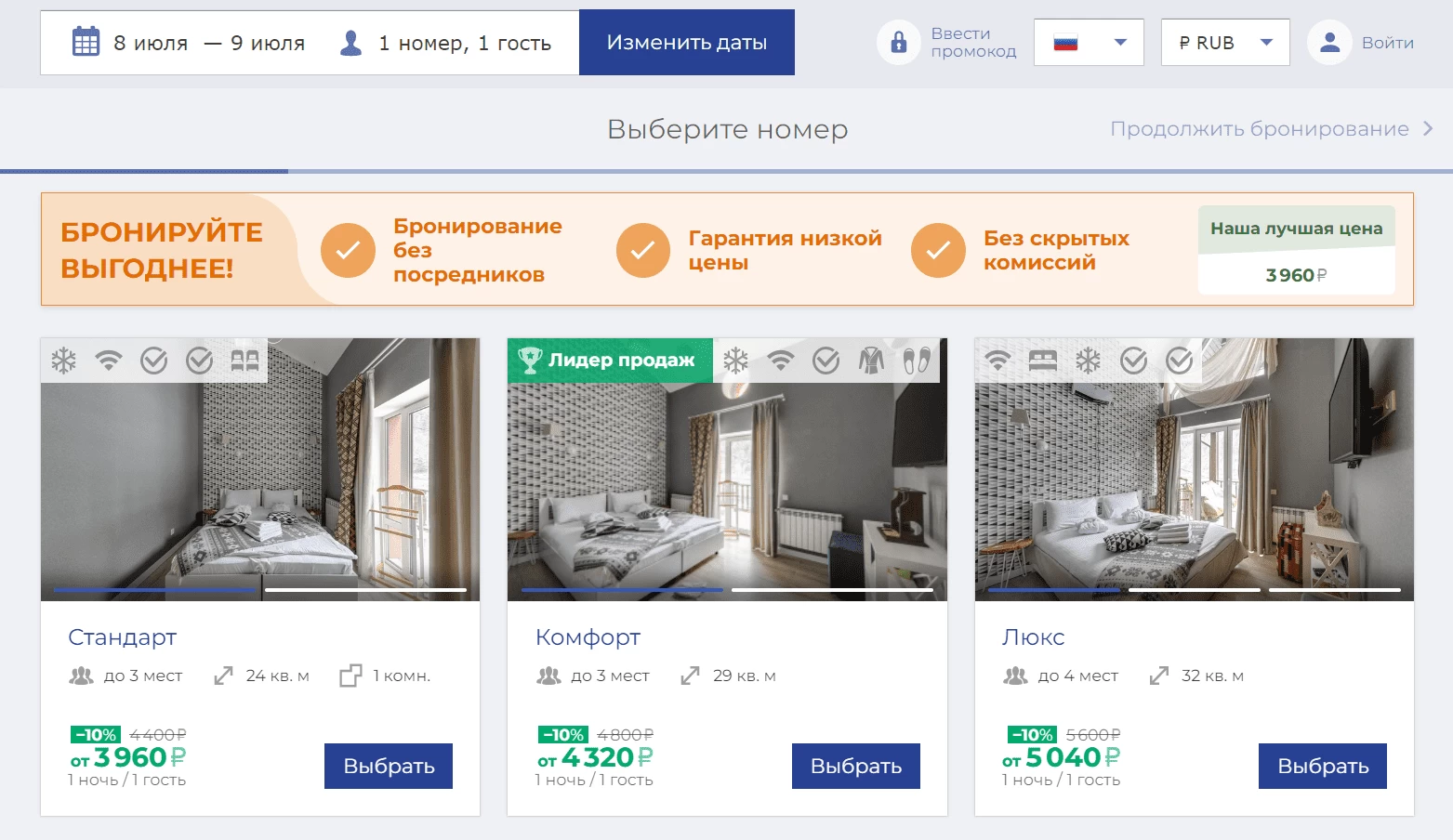 В процессе бронирования система предложит сменить номер на более комфортный или добавить дополнительные услуги, например, питание или трансфер до аэропорта. Все это позволит увеличить стоимость брони и средний чек.