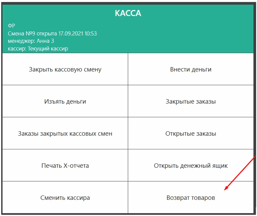 Перейдите в меню во вкладку Возврат товара. Далее выберите из списка те блюда, за которые клиенту нужно вернуть деньги. Возврат будет произведен по текущей цене в прейскуранте. Чтобы изменить цену возврата, нажмите