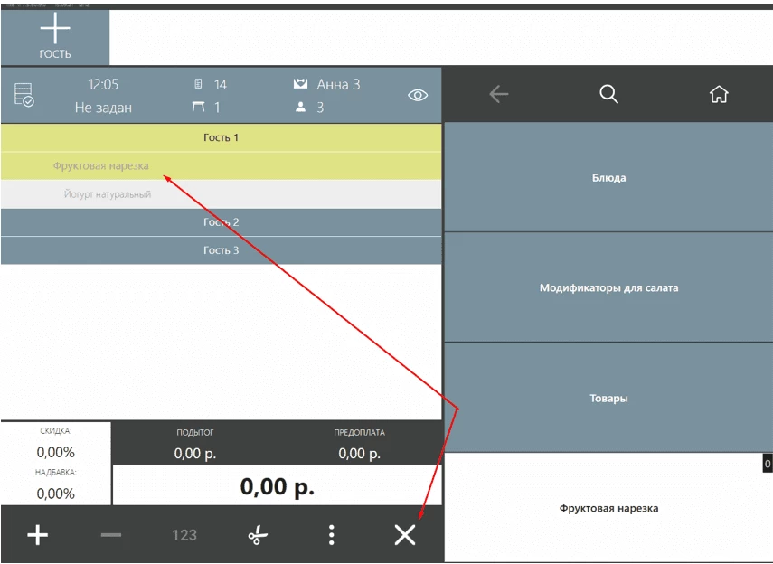 На следующем этапе нужно изменить состав заказа. Чтобы удалить блюдо из заказа, нажмите на Х внизу экрана.