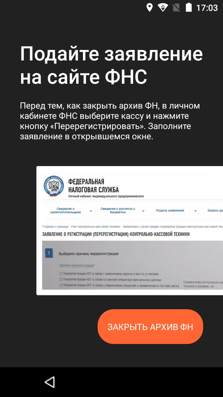 Далее нажмите Закрыть архив ФН. Также Эвотор предупреждает вас о том, что нужно перерегистрировать кассу в налоговой, если вы хотите в дальнейшем ее использовать.