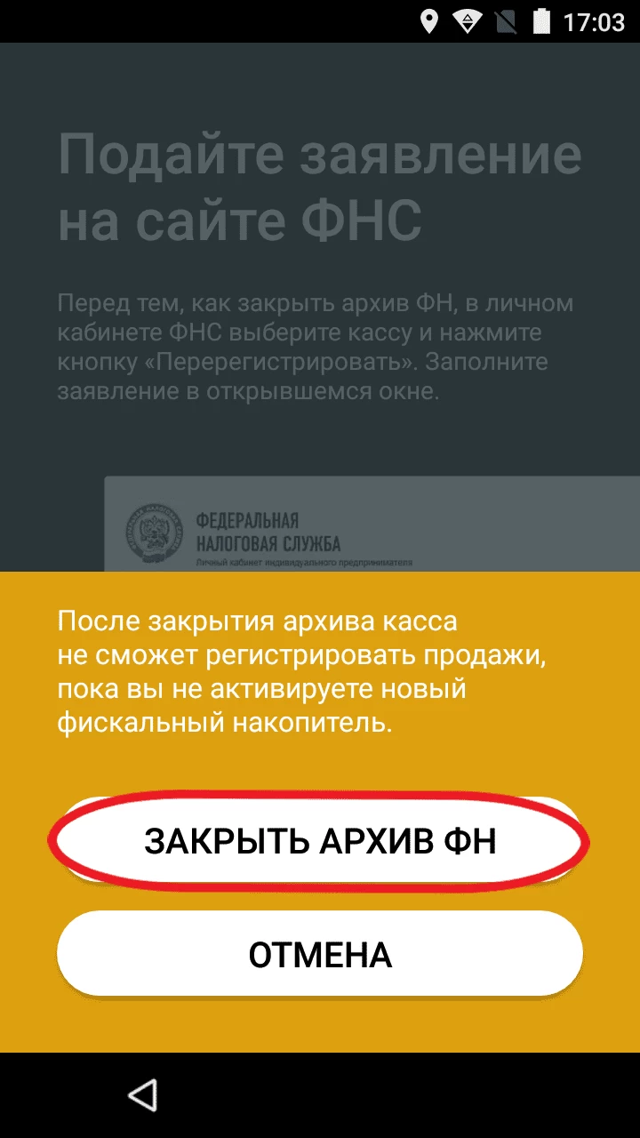 В новом окне нажмите Закрыть архив ФН.