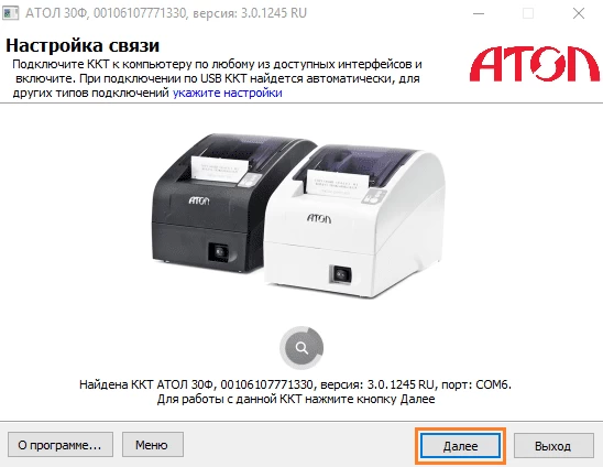 Для того, чтобы закрыть ФН на кассе Атол, нужно подключить кассу к компьютеру и запустить программу “Утилита для регистрации ККТ АТОЛ”. После запуска откроется окно с информацией о кассе, нажмите кнопку Далее.