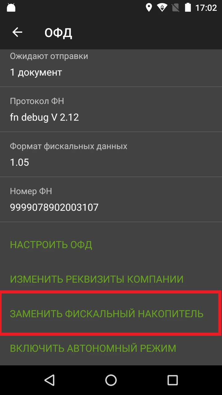 В открывшемся окне нажмите Заменить фискальный накопитель.