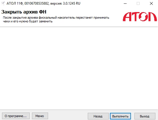 Для завершения нажмите кнопку Выполнить в окне Закрытия архива ФН.