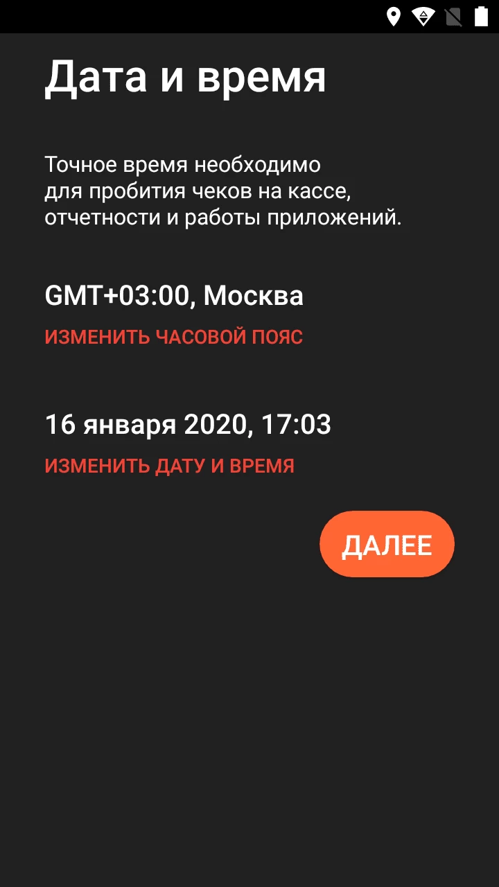 Проверьте дату и время, чтобы закрытие произошло корректно. Если нужно, установите значения вручную и нажмите Далее.
