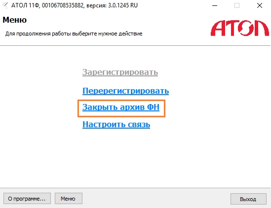 В Меню выберите пункт Закрыть архив ФН.