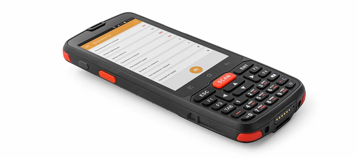 Устройство оснащено сенсорным экраном с диагональю 3.2 дюйма, удобной большой клавиатурой на 32 клавиши, с которой будет комфортно работать даже в перчатках, и предустановленным ПО 1С: Мобильная торговля. Экран не очень большой, особенно для работы с большими документами, но физическая клавиатура исключает неудобство в работе с ТСД.
